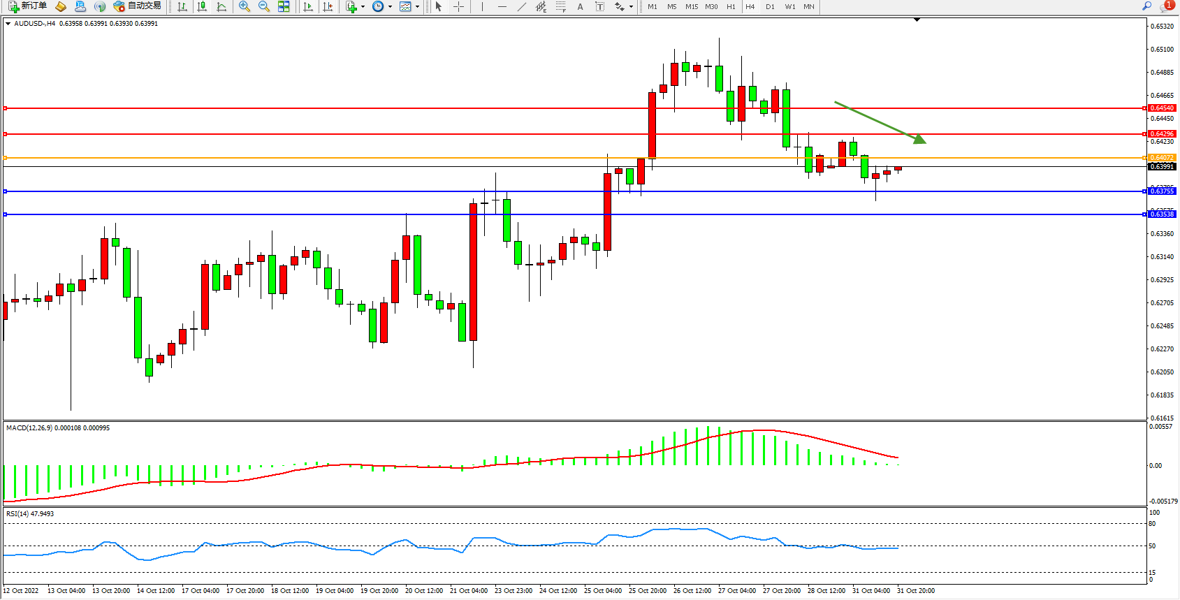 澳元美元AUDUSD——4小时K线图显示: