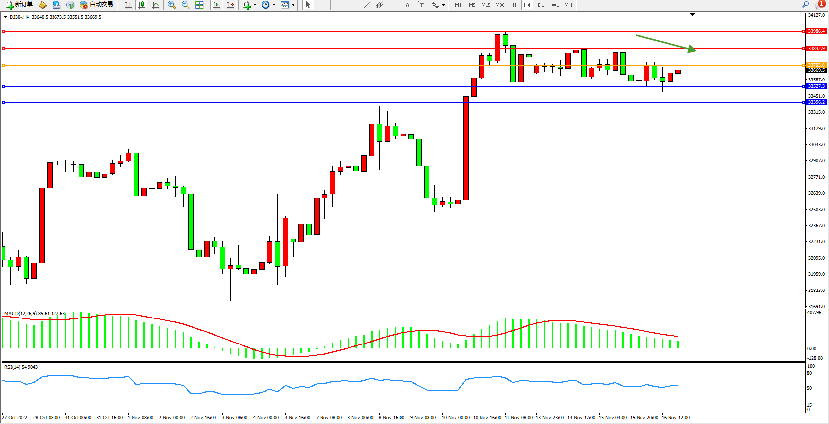 道琼斯指数DJ30——4小时K线图显示: