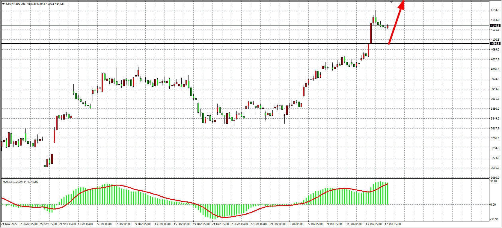 1小时图看,沪深300在1450附近盘整,高位形成滞涨局面,但MACD量能在仍在零轴之上继续呈现持续放量状态,上行趋势未改,当前支撑已上移4086附近,上方目标看4200-4250附近。