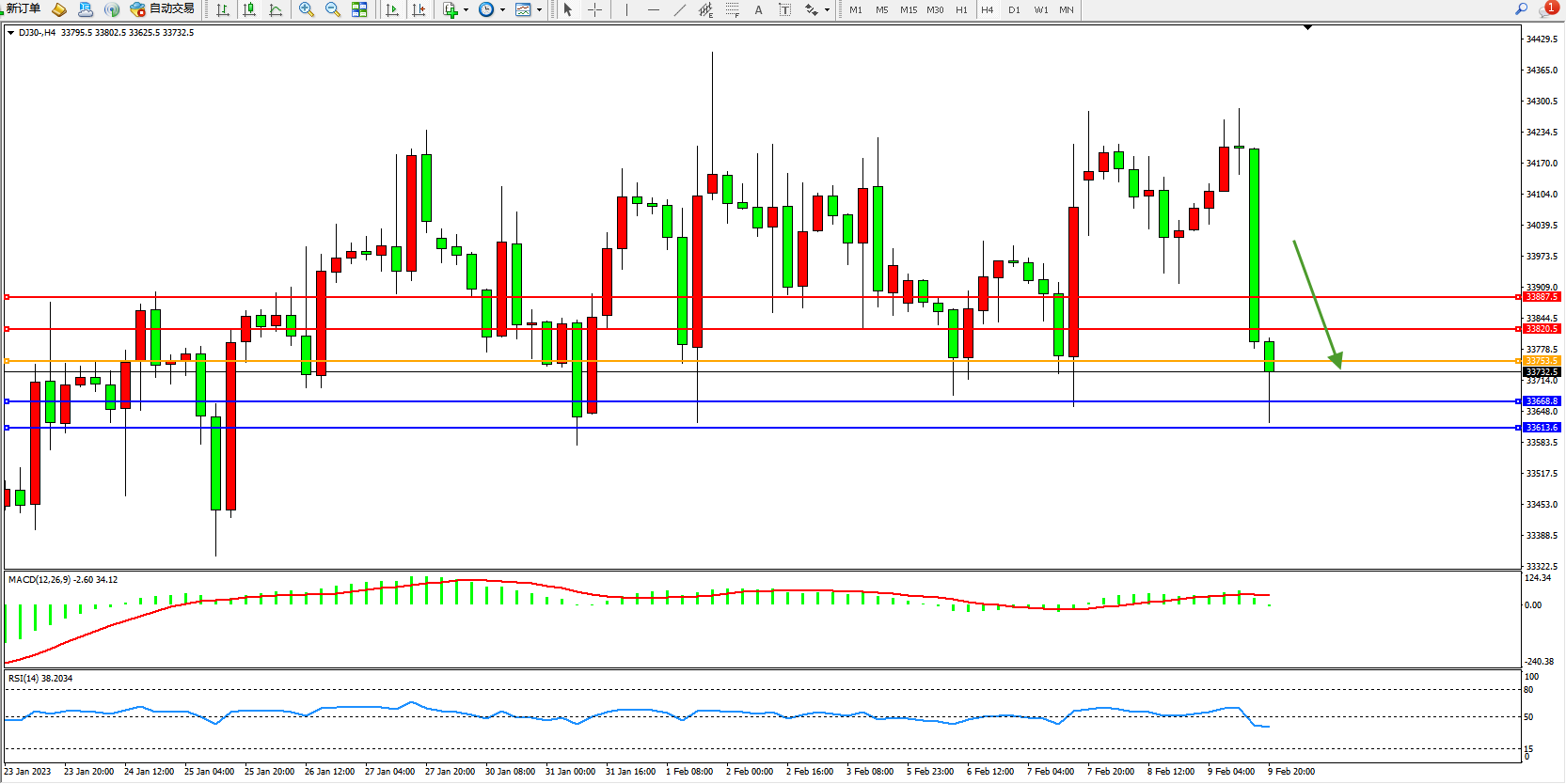 道琼斯指数DJ30——4小时K线图显示: