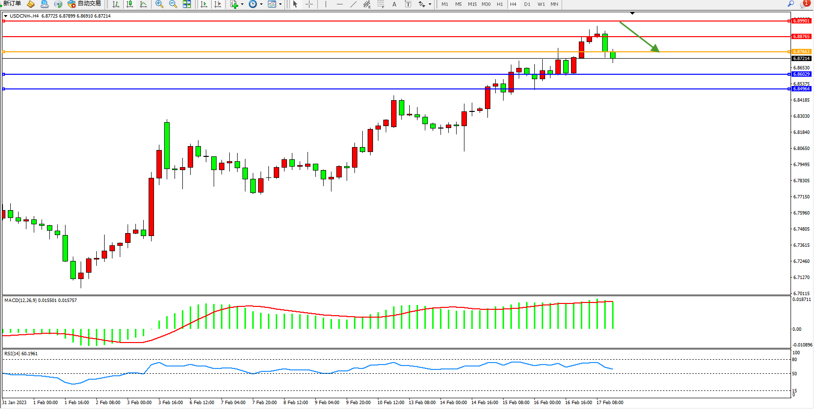 美元人民币USDCNH——4小时K线图显示: