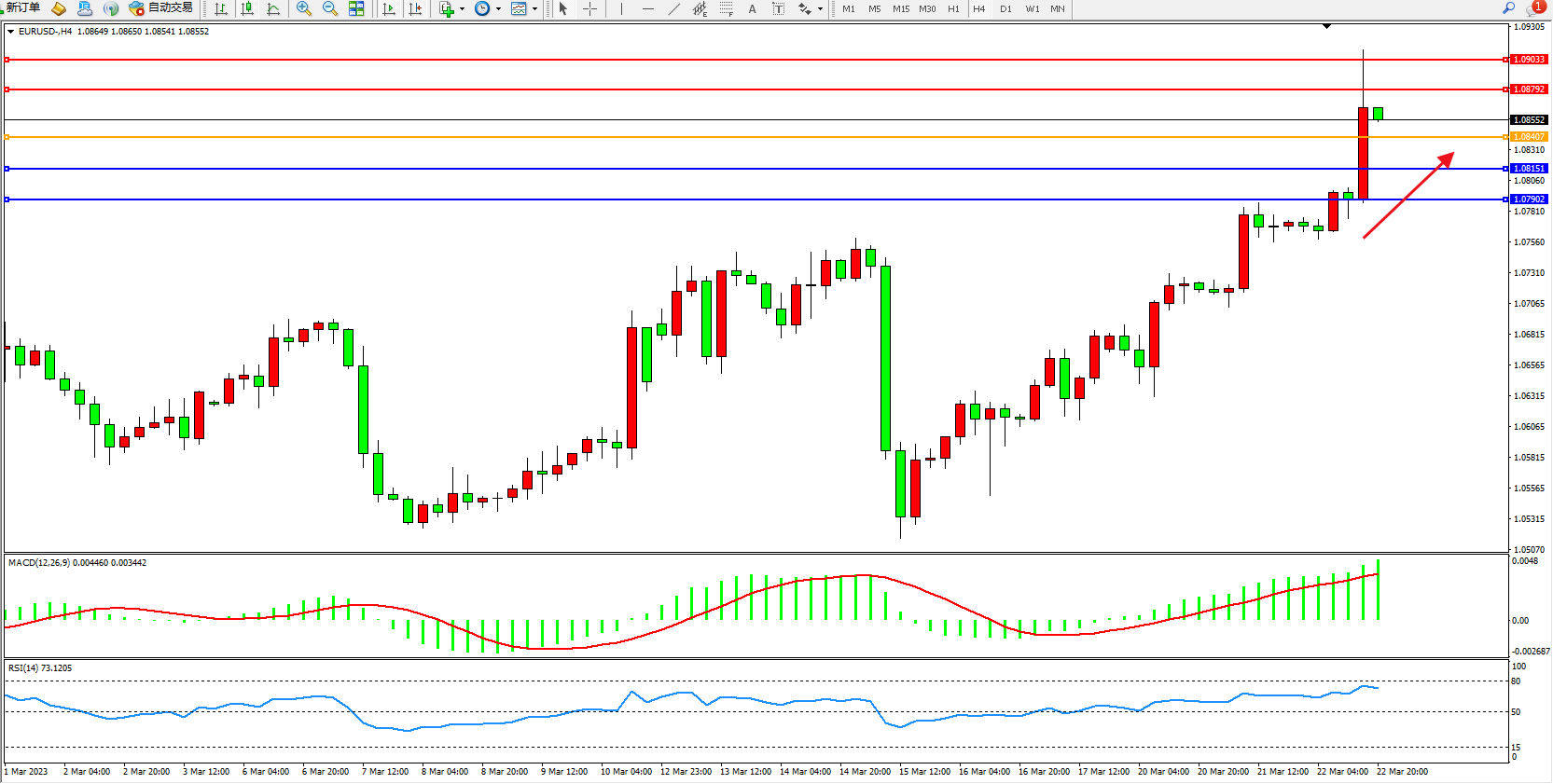 4小时图看:高位多头动力持续攀升,短期看涨情绪笼罩,市场多头不断向上拉升中,MACD指标处于多头区域持续上移,RSI指标处于多头区域高位上行;