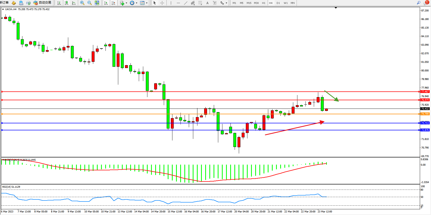 交易策略:74.799上方看涨,目标76.474 77.467