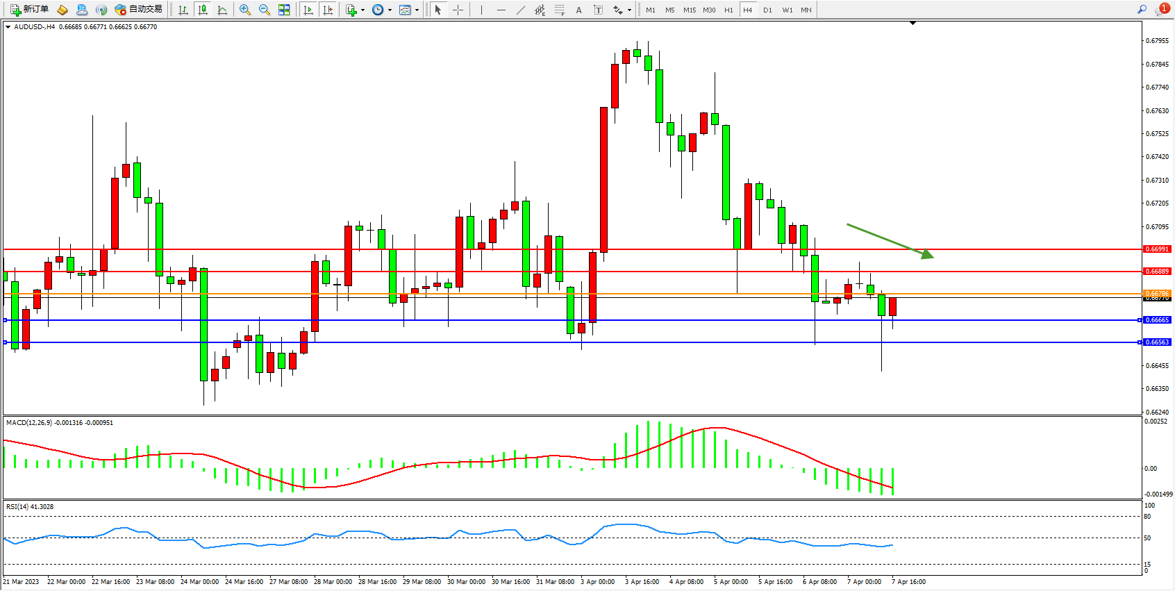 交易策略:0.66786下方看跌,目标0.66665  0.66563