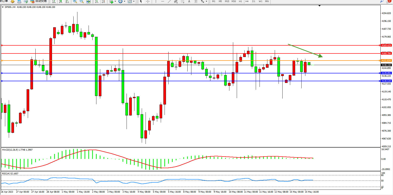 标普500指数5月15日(周一)收盘上涨13.42点,涨幅0.33%,报4137.50点;美国史无前例的潜在违约将使该国陷入衰退,并给全球金融市场带来混乱,这种僵局已开始令投资者和消费者担忧。