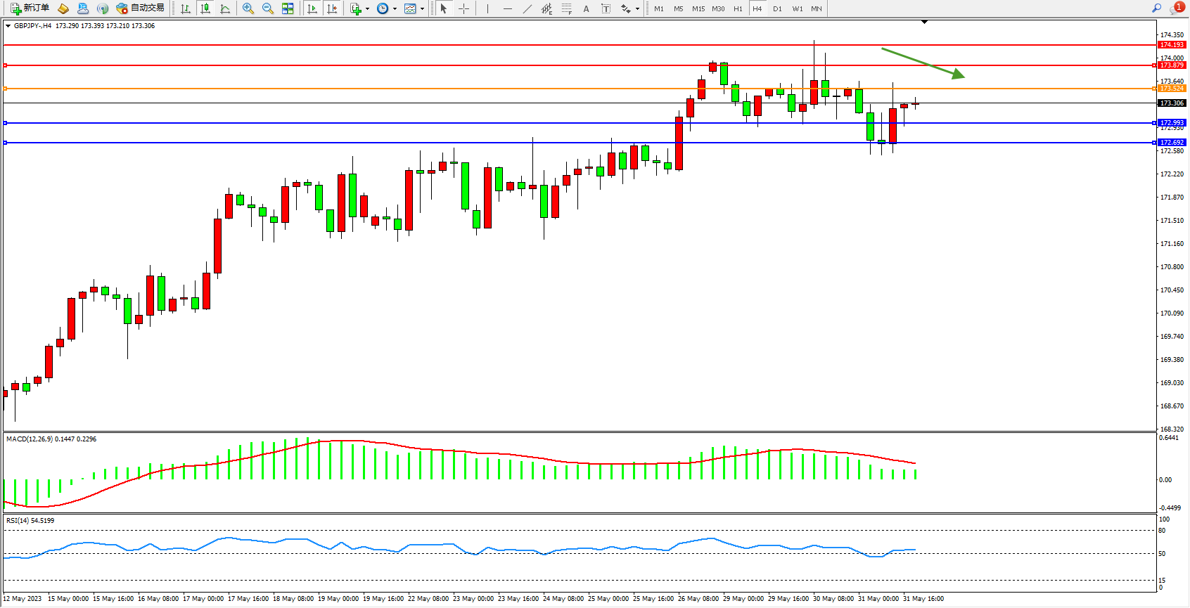 交易策略:173.524下方看跌,目标172.993 172.692