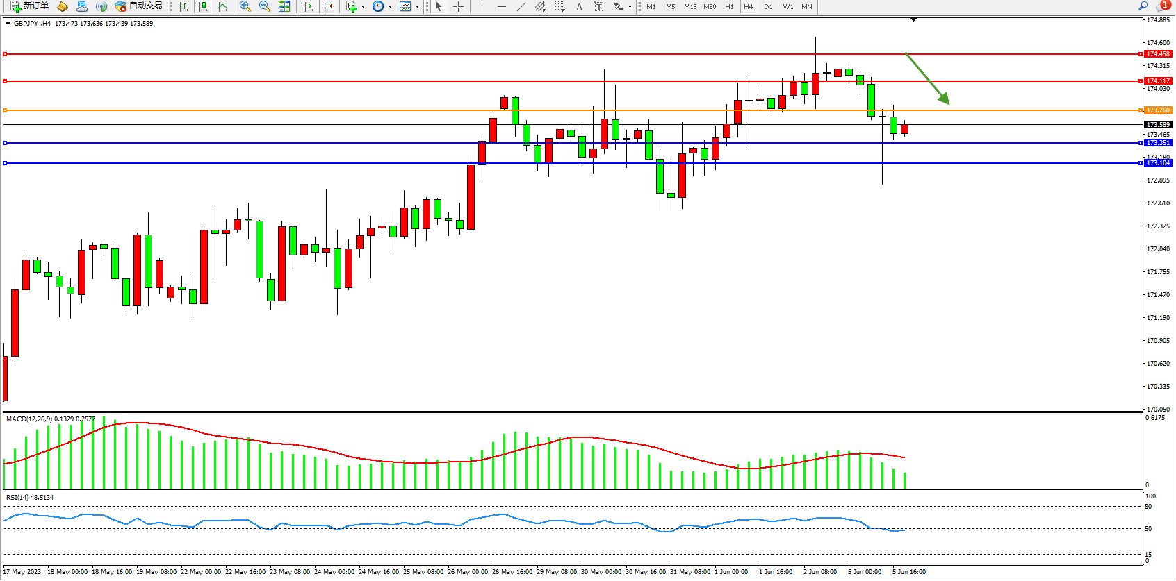 交易策略:173.760下方看跌,目标173.351  173.104