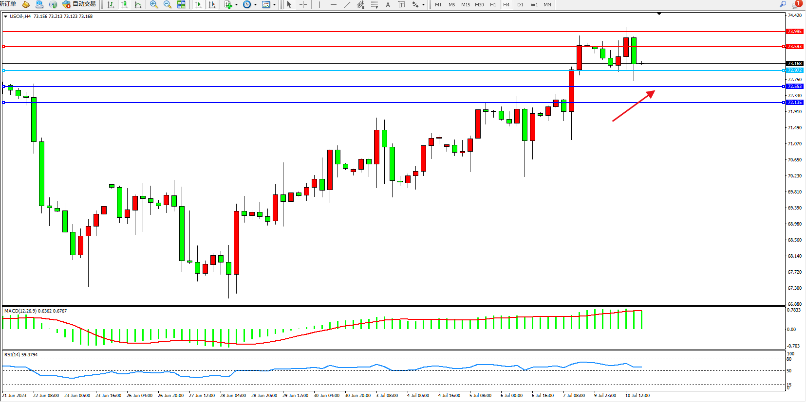 交易策略:72.972上方看涨,目标73.893  73.995