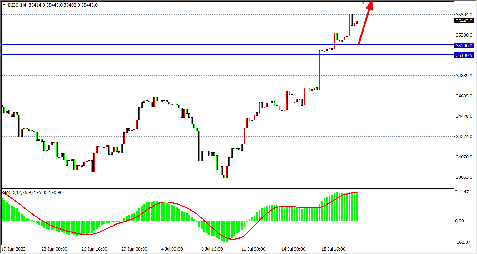 4小时图看,道指继续走高至35500附近,MACD量能维持零轴上放量,多头趋势强劲,支撑上移35200-35100附近,阻力35500-35800。