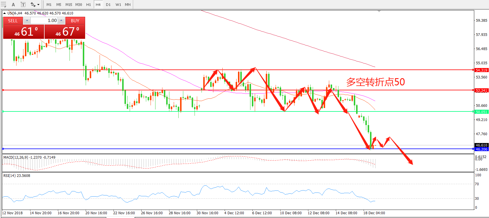 小时图看,油价跌破前期箱体低点,目前在46美金处暂时企稳。均线系统呈空头排列,MACD绿柱增加,RSI指标处于超卖区域,日内有可能小幅反弹,但大方向偏空无疑。