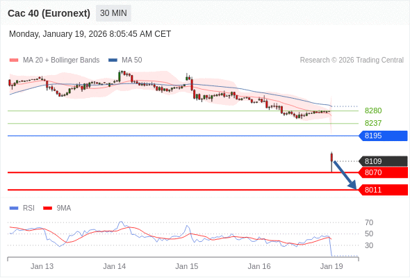法国CAC指数期货 (Euronext) (G6) 当日内: 下跌趋势。