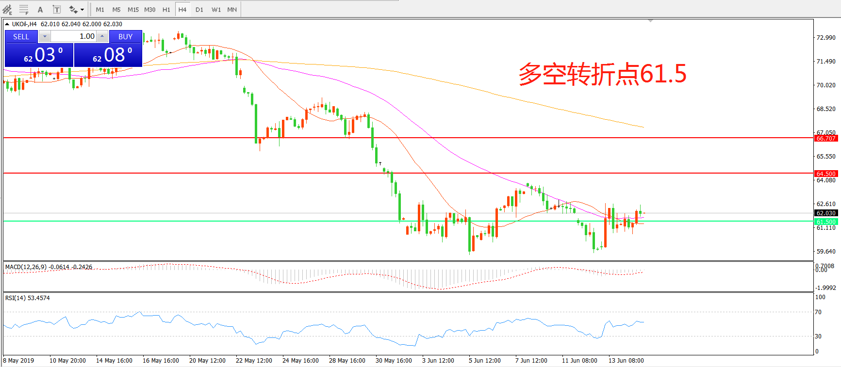 交易策略:在61.50之下看跌,目标57.50    53.00