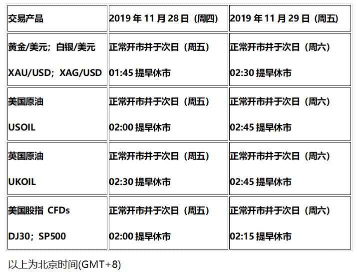 1.外汇货币对和其他股指产品的交易不受本次欧美市场感恩节假期休市影响。