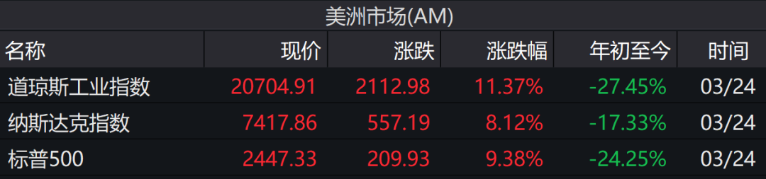 昨夜美股道琼斯指数暴涨超2100点,一天的涨幅就超过了11%,创下1933年来最大涨幅。标普500指数涨幅达9.38%,创2008年10月份以来最大单日涨幅,报2447.33点。纳斯达克综合指数涨幅8.12%,创逾一周最大单日涨幅,报7417.86点。