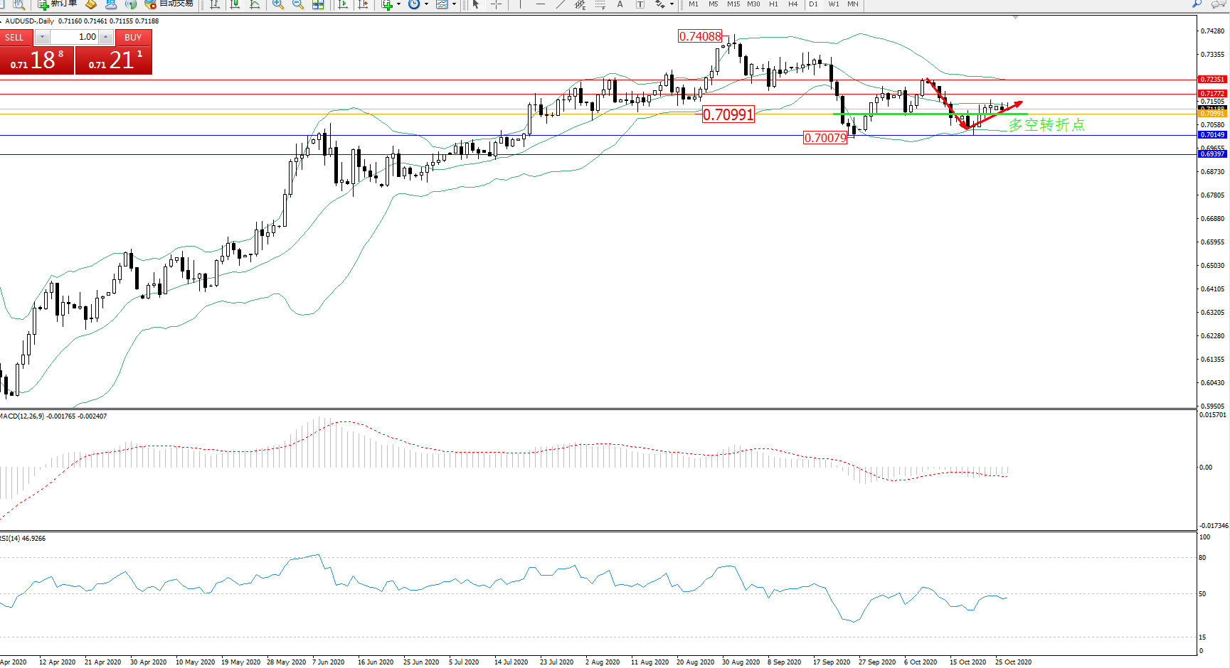 交易策略:0.70991上方看涨,目标0.71772、0.72351