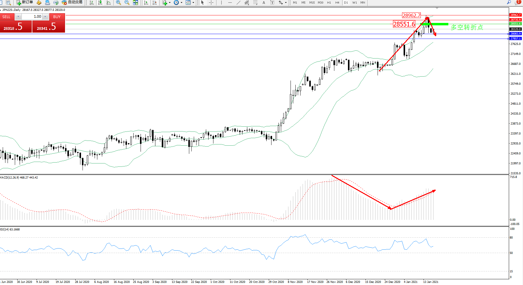 技术点评:多头动力延续布林带指标通道上轨附近持续震荡上扬至28962位置短暂遇阻回撤,纠结于中上轨区间窄幅震荡中,布林带指标呈收口走势向上移动持续中,MACD指标处于多头区域持续震荡上扬态势良好,高位出现短暂回撤走势,RSI指标处于多头区域高位出现回撤走势;