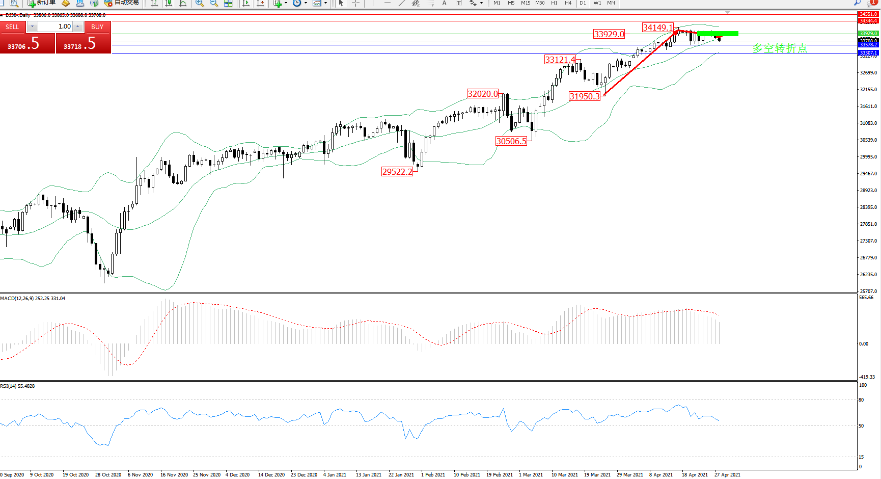 道琼斯指数4月28日(周三)收盘下跌162.25点,跌幅0.48%,报33805.56点;美股收盘,三大股指集体收跌,美联储宣布维持利率不变后美债收益率和美元下跌,美联储政策宽松基调延续,仍继续围绕疫情说事,新冠病毒疫情状况仍是美联储官员当前关注和焦虑的关键点, 美联储发布决定后,10年期国债收益率最初升至近1.66%,然后随着鲍威尔新闻发布会的进行而回落,徘徊在1.61%左右,跌幅约为1个基点。鲍威尔重申尚未准备开始讨论收缩购债计划;衡量投资者通胀预期的10年期盈亏平衡通胀率周三逼近2.43%的2013年4月来高位,尽管美联储官员再次强调,事实将证明近期实际通胀率上升是短暂的。