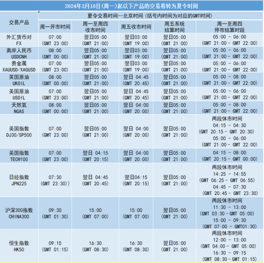 因应美国时区于2024年3月10日(周日)与欧洲时区于2024年3月31日(周日)分别开始转为夏令时间, 本公司各产品交易时间将以下表安排调整为夏令时间,敬请留意。